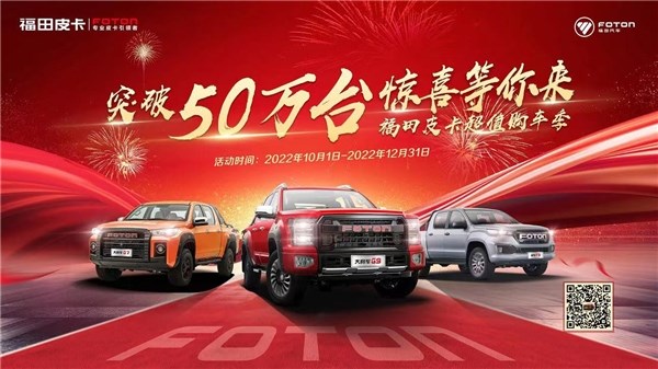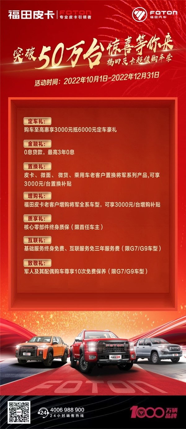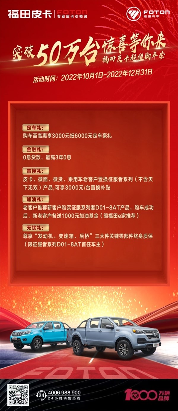 迎十一,慶國慶,為慶賀福田皮卡銷量即將突破50萬臺(tái),“福田皮卡超值購車季”火熱開啟!從10月1日起,大將軍皮卡系列產(chǎn)品推出定車禮、金融禮、置換禮、增購禮、質(zhì)享禮、互聯(lián)禮及致敬禮七重大禮包,福田皮卡征服者系列產(chǎn)品推出定車禮、金融禮、置換禮、加油禮及無憂禮五重大禮包,價(jià)值百萬的硬核“壕”禮回饋新老客戶,多重福利疊加,超值超燃超禮遇!千萬不能錯(cuò)過!