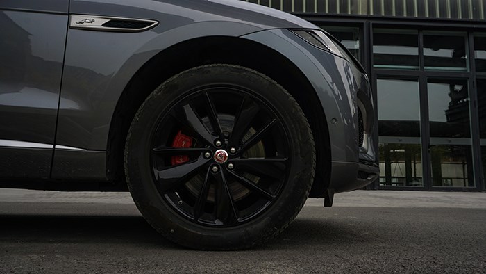 這個版本的捷豹F-PACE輪圈尺寸為20英寸,全黑涂裝換來的車身造型也很吸引眼球,動感十足。該輪胎規格為255/50 R20,紅色剎車卡鉗在黑色映襯下非常搶眼。