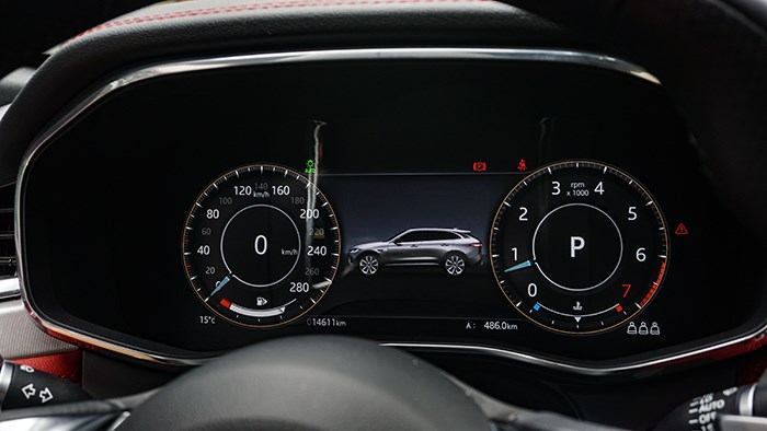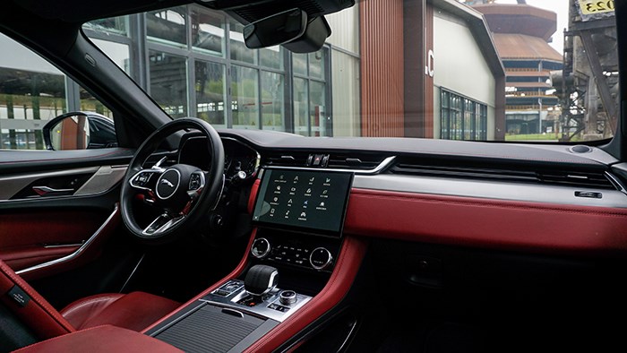 改款后的捷豹F-PACE的中控屏幕尺寸變大(11.4寸),雖然初次看上去以為就是簡單鑲嵌了一塊液晶屏,但細看才發現,這是一塊根據儀表臺造型而設計的曲面液晶屏,體現出設計師的嚴謹。而液晶儀表盤就已經達到了12.3英寸,而且畫面精細度不錯,除了正常的儀表信息顯示外,還可以直接顯示地圖及導航信息??照{旋鈕往上提,可以控制風量大小,往下按則是前排座椅的加熱與通風,這個設計也是花了點心思的。