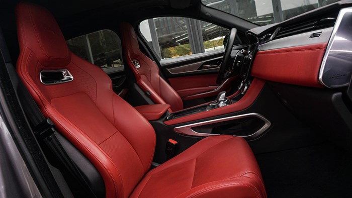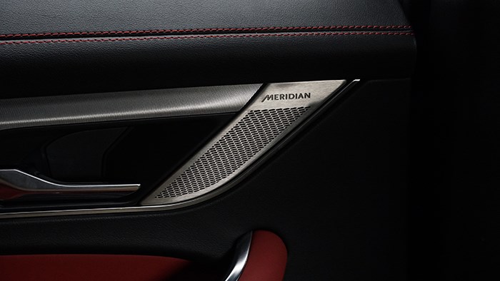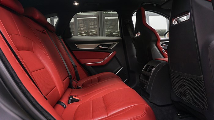 前后排的座椅都比較寬大舒適,縱向尺寸充裕。前排座椅是一對運動桶椅,可能看到薄薄的頭枕設計你會擔憂其舒適性。實際乘坐感受是值得稱贊的,肩部以下至腿部的支撐和包裹性都不錯,柔軟程度適中。而后排靠背傾斜角度適中,腿部和頭部空間尚可。另外這臺捷豹F-PACE還配備了13聲道的Meridian音響。
