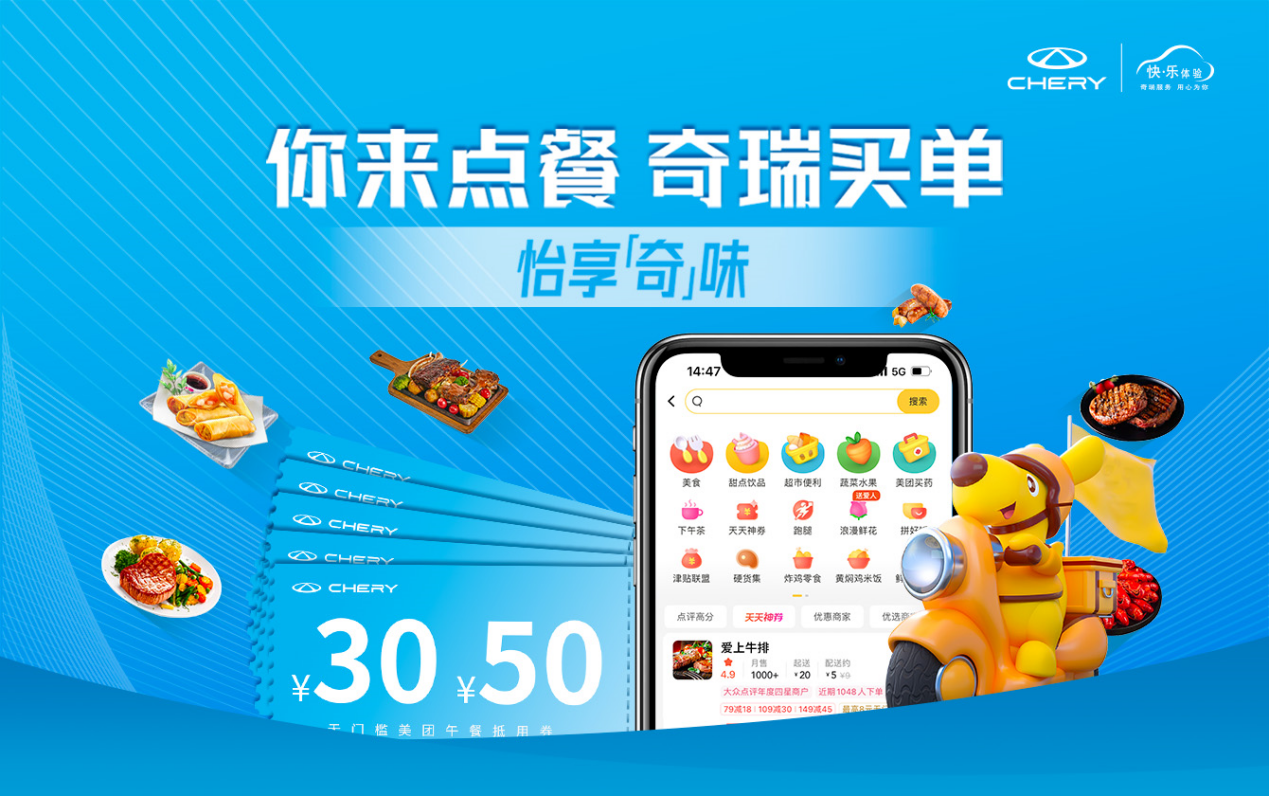 吃一頓飯不難,但要吃好一頓飯可不簡單,你愛麻辣,她愛甜,到底怎樣還是對食客最真摯的情感呢?奇瑞便是基于這樣的洞察,推出“怡享“奇”味“活動,把絕對權交到用戶的手中,“你來點餐、奇瑞買單”,愛吃什么更隨心。即日起進站維保的車主/送修人及同行人,享受至高50元無門檻美團點餐抵用券,助力您的午餐之旅更美妙。