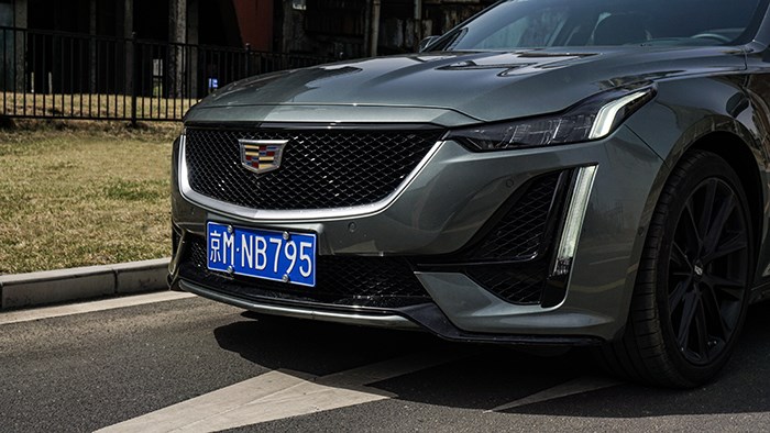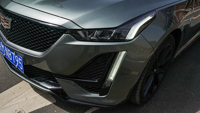 CT5的前臉設計還是以大中網為主,我們此次的頂配鉑金版本是網格式的中網,偏運動的風格。富有感染力的盾型格柵輪廓,與凱迪拉克品牌Logo形成了默契的呼應,而內部的菱形中網,恰如一副堅不可摧的鎧甲。