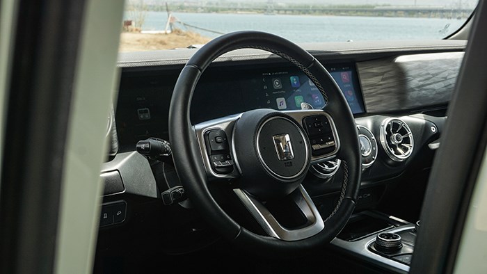 方向盤很有力量感,握感舒適,氣囊蓋上還使用了縫線以及圓環進行點綴,營造出不錯的精致感。