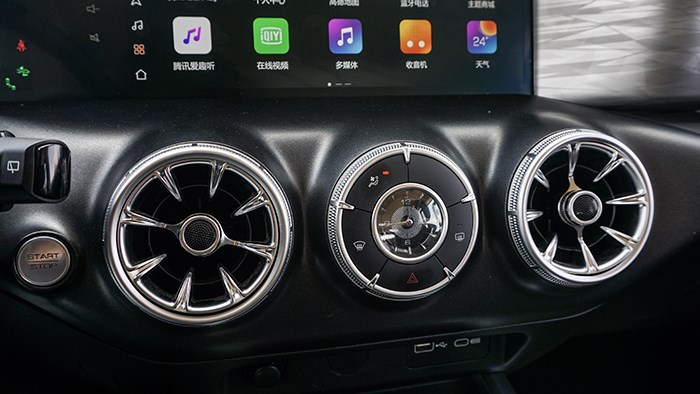空調出風口為漩渦的造型,兩側為真正的出風口,中間則是集成了空調控制面板以及機械鐘表。在夜間新車氛圍燈的營造氛圍感滿滿。