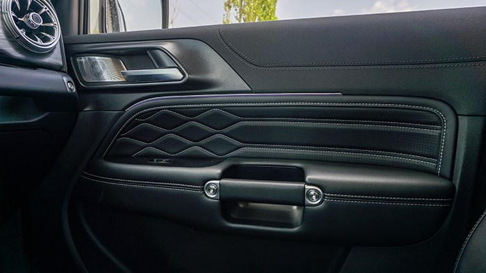 車內大量采用皮質材料和縫線進行包裹,細節之處還使用了一些金屬質感的材料進行點綴,細節也禁得起推敲。包括門板上都使用了細膩的皮質進行包裹,縫線造型也是花了一些小心思。