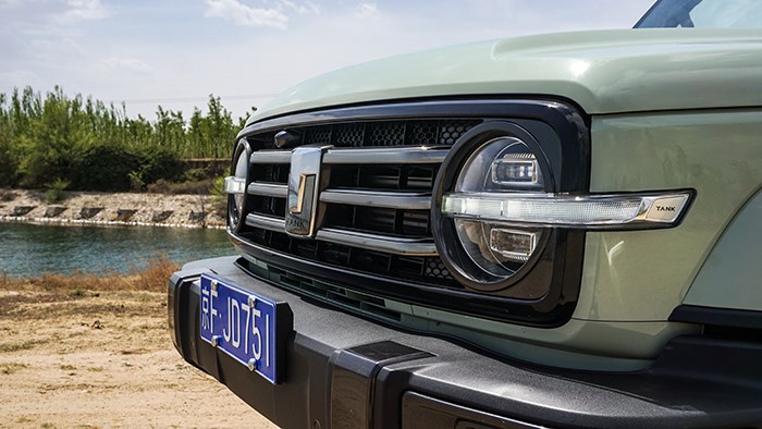 這款車的配色是十分招人喜歡的,以至于跑在路上的回頭率很高,官方對這款顏色的命名是種草綠。有一種大自然、小清新的味道。從外觀上看,坦克300的車頭是硬朗的風格,前中網由三條粗壯的鍍鉻飾條組成,比較符合坦克300的硬派氣質。