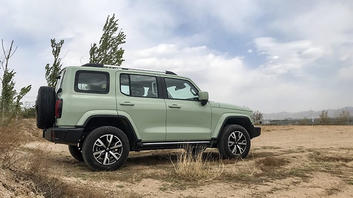 坦克300的側面輪廓四平八穩,擁有外突的大輪眉,并使用與車身同色的涂裝。車身上也沒有使用太多復雜的線條,觀感比較干練。