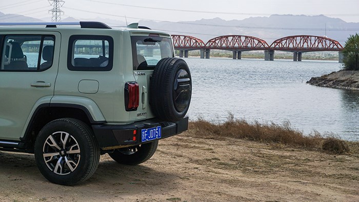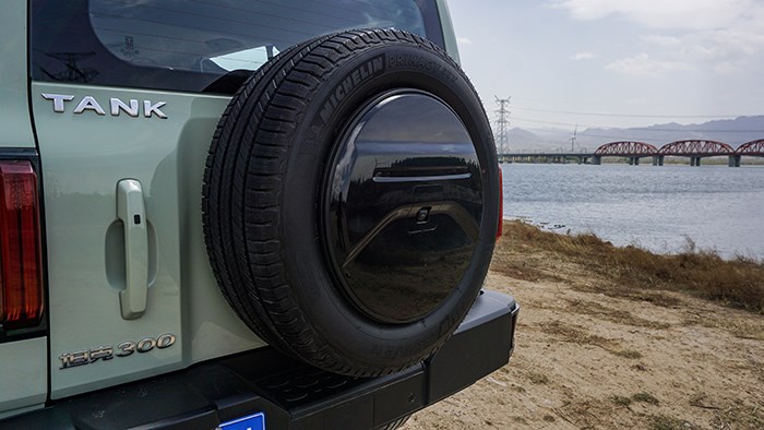 很多越野車都會選擇外露備胎的方式,不過坦克300還為備胎配備了輪胎保護罩,攝像頭巧妙的放在了中間部位。
