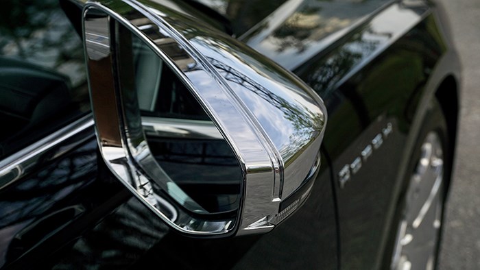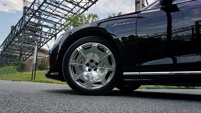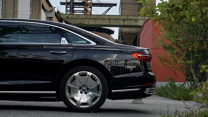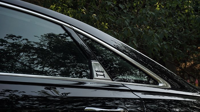 C柱附近的H王冠專屬徽章是車身側面特別引人注意的一處設計,也顯示出這臺加長猛獸絕不普通。