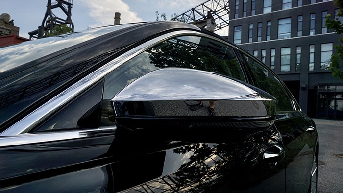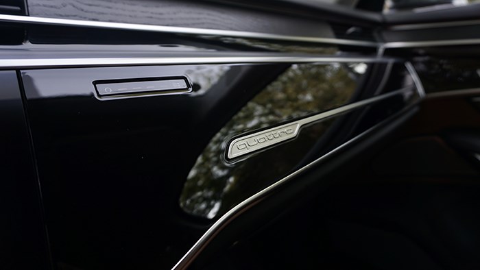 除了大型鍍鉻中網,還有霧燈裝飾罩、反光鏡,以及后杠等處運用了更多的鍍鉻裝飾,尤其是電鍍的反光鏡在奧迪車型中很少見。
