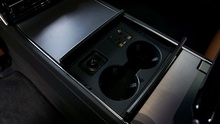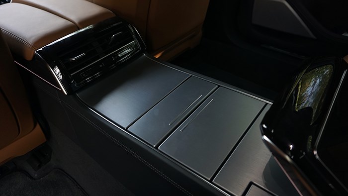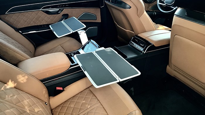 后排中央扶手抬起后,左右各有一個小桌板可以拉出,方便后排乘客臨時辦公使用。這不僅是Horch創始人版高于普通版A8L的配置,更是對后排乘客需求的充分滿足。