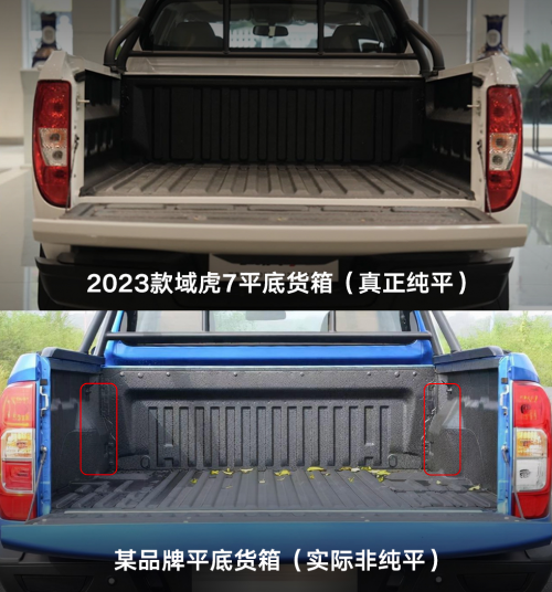 作為一款兼具商用與乘用功能的皮卡,強大的裝載能力自然必不可少。2023款域虎7同步推出平底貨箱車型,相較于行業上普遍存在的平底貨箱車型,由于其無法避讓燃油管道,通常采用預留鼓包的設計,既不美觀,又會影響空間利用率。