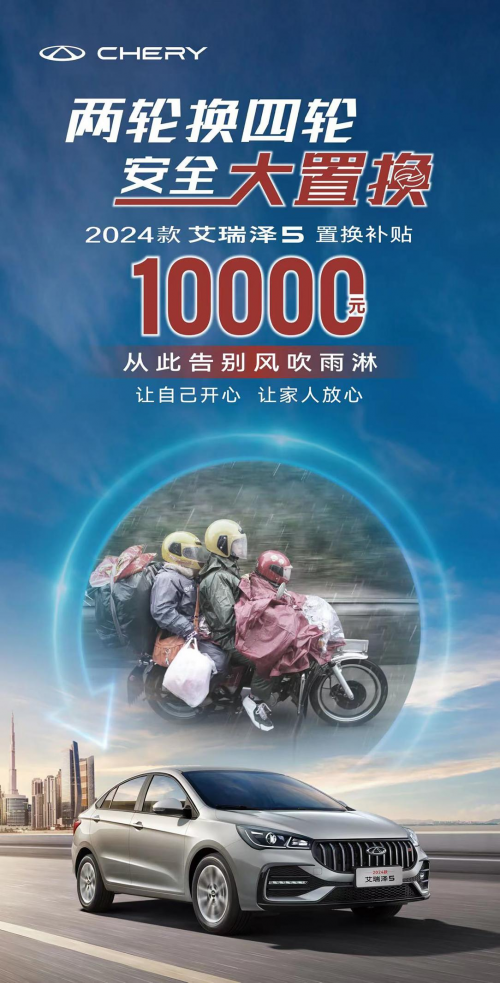 我們常說摩托車代表風與自由,但對于在嚴寒暴雪中返鄉的摩托車大軍而言,更多的是一種“無奈”。即便你不是返鄉摩托大軍中的一員,但家里摩托車常年“躺平”、放著落灰,你是否有用之不及,棄之可惜的感慨。所以,從沒車到有車,是一種生活方式的轉變。從有車到換車,是一種生活品味的轉變。你是時候用兩輪的它,“換”一種新生活了。2024款艾瑞澤5既能為你遮風擋雨,又能讓你冬暖夏涼,堪稱日常出行的最佳伙伴。更何況現在置換可享受10000元補貼,不要再猶豫不決了,趕緊參與2024款艾瑞澤5兩輪換四輪安全大置換活動,將心儀好車開回家吧。