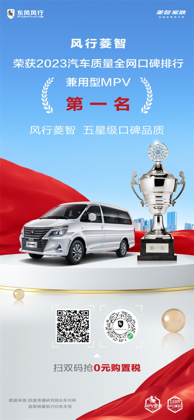 出類拔萃的產(chǎn)品質(zhì)量,讓東風(fēng)風(fēng)行性質(zhì)受到行業(yè)和用戶的廣泛認(rèn)可,收獲了眾多榮譽(yù)。在日前的J.D.POWER 2024年度論壇暨頒獎(jiǎng)典禮上,東風(fēng)風(fēng)行菱智一舉奪得“2023中國(guó)汽車產(chǎn)品魅力指數(shù)緊湊型MPV第一名”和“2023中國(guó)新車緊湊型MPV質(zhì)量第一名”兩項(xiàng)桂冠。而在四度傳播研究院(SAC)?聯(lián)合車問(wèn)網(wǎng)發(fā)布的“汽車質(zhì)量全網(wǎng)口碑排行”中,東風(fēng)風(fēng)行菱智則在兼用型MPV中排名第一,成為屈指可數(shù)的五星級(jí)口碑品質(zhì)車型之一。