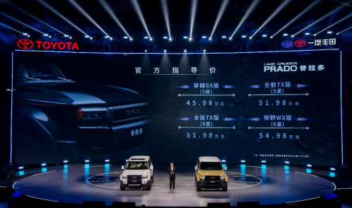 此次發(fā)布會上,備受關注的全新普拉多也正式發(fā)布官方指導價,新車包含:穿越BX版(5座):45.98萬元:全能TX版(5座):51.98萬元、全能TX版(6座):51.98萬元、悍野WX版(6座):54.98萬元,四大版本覆蓋了硬派越野從個性化、時尚化再到高端化等不同細分市場。同時,一汽豐田還推出官方聯(lián)名改裝商品線“上新了!PRADO”,首批官方改裝套件的探索套裝、精英套裝和蒙娜麗莎套裝也正式開啟預售,供用戶從心而選。