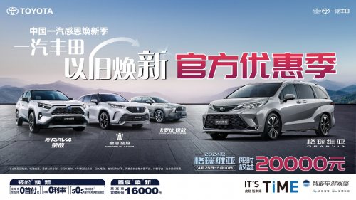 不止如此,一汽豐田還公布了“以舊煥新官方優(yōu)惠季”的開啟信息,全面響應國家政策,在原有優(yōu)惠基礎上加碼增新,4月25日-5月10日,2024款格瑞維亞尊享20000元限時權益,一汽豐田全車系可享至高8年0首付起、36期0利率、505 彈性金融方案等多重金融政策,及至高16000元的置換補貼,助力用戶輕松開啟高品質出行生活。展示出一汽豐田作為央企合資企業(yè),賦能中國汽車行業(yè)實現(xiàn)高質量發(fā)展的責任與擔當。