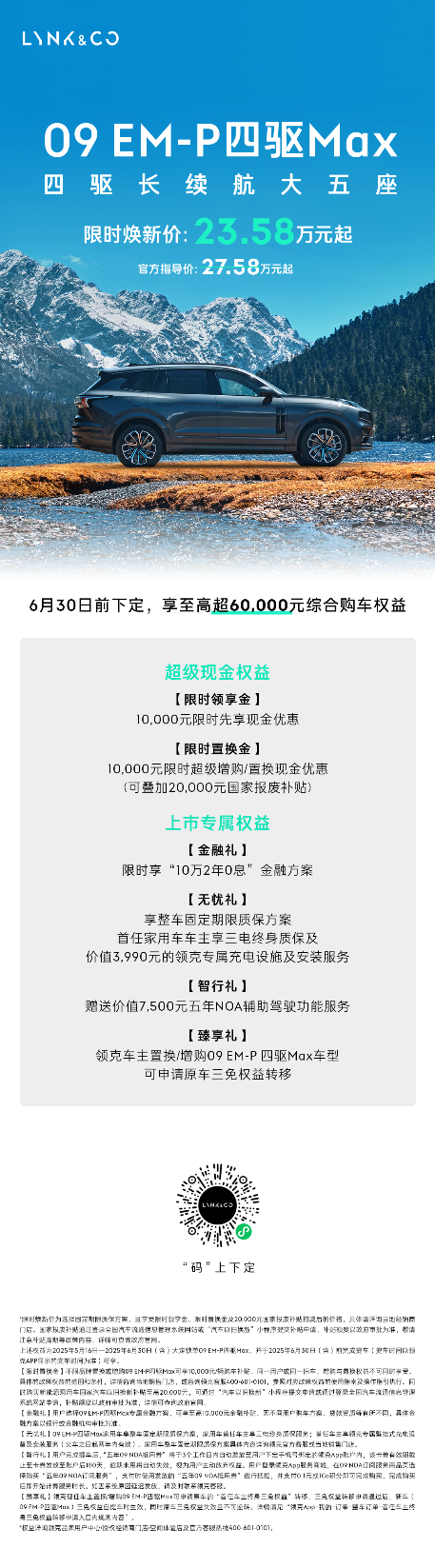 領(lǐng)克09 EM-P四驅(qū)Max大五座,不僅滿足當(dāng)代年輕用戶對(duì)大五座插混SUV多樣化出行的需求,更是送上六重福利。用戶在6月30日前下定享至高超60000元綜合購(gòu)車權(quán)益,包括10000元限時(shí)領(lǐng)享金、10000元限時(shí)超級(jí)增購(gòu)/置換現(xiàn)金優(yōu)惠(可疊加20000元國(guó)家報(bào)廢補(bǔ)貼)、“10萬(wàn)2年0息”限時(shí)金融方案、價(jià)值7500元五年NOA輔助駕駛功能服務(wù)、整車固定期限質(zhì)保方案、首任家用車車主享三電終身質(zhì)保及價(jià)值3990元的領(lǐng)克專屬充電設(shè)施及安裝服務(wù)。此外,領(lǐng)克車主置換/增購(gòu)09 EM-P四驅(qū)Max車型可申請(qǐng)?jiān)嚾鈾?quán)益轉(zhuǎn)移。多重福利加持,助力用戶輕松擁有全場(chǎng)景自由出行體驗(yàn)。
