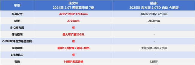 忙工作、忙生活,誰不想路上也能輕松一點?一輛好開的、夠舒服的SUV,或許就是忙碌生活里的松弛感來源。在15萬級熱門家用SUV中,誰更懂你?今天,我們就以該區(qū)間內(nèi)最為熱門的兩款車型——瑞虎8L 2024款 2.0T 兩驅(qū)尊貴版 7座(以下簡稱:瑞虎8L)以及星越L 2025款 東方曜 2.0TD 自動 今朝版(以下簡稱:星越L)為例,看看誰更“善解人意”。