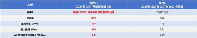 星越L的動力系統(tǒng),搭載的也是2.0TD發(fā)動機以及8AT,不過其發(fā)動機最大功率為175kW,峰值扭矩350N·m。相比之下,如果遇到需要連續(xù)加速,或是遇到需要爬坡的路段,瑞虎8L的后勁可能更大,也更容易給人駕駛信心。另外,星越L的WLTC綜合工況油耗為7.79L/100km,和瑞虎8L差不多,都是SUV里面比較高經(jīng)濟性的車型。