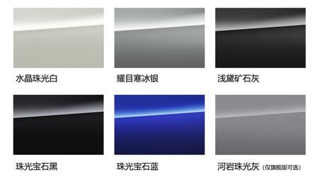 車身顏色除提供水晶珠光白、耀目寒冰銀、珠光寶石黑、珠光寶石藍(lán)、淺黛礦石灰經(jīng)典配色外,新增了靈感源自自然元素的全新專屬車身顏色“河巖珠光灰”(僅旗艦版可選),以滿足不同用戶的個(gè)性化需求。