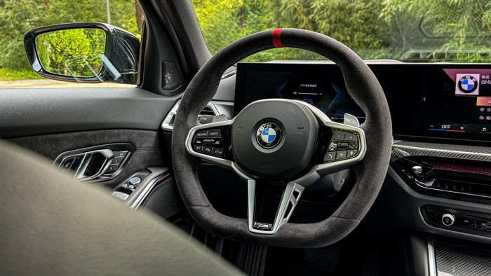 懸浮式液晶屏配合全新造型的電子擋桿以及平底式式麂皮M運動多功能方向盤,讓新車看上去十分年輕、運動,換擋桿區域的裝飾面板采用碳纖維面板,并設計有50周年限量版徽章,視覺和觸感上質感一流。